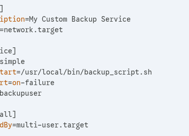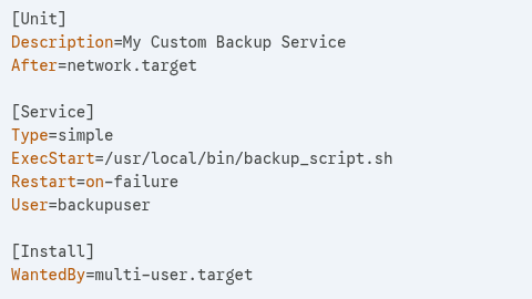 If you were to create a service for a simple script that creates backups, it would look like this. These files are typically stored in /etc/systemd/system/.